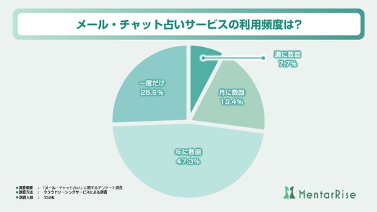 「メール・チャット占いサービスの利用頻度はどれくらいですか?」という質問に対して得られた回答は、上記の円グラフのような結果となりました。