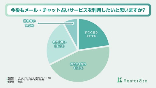 「すごく思う(45.0%) 」に次いで「おそらく思う(22.7%) 」という結果となり、これらを合わせて約7割のユーザーが、今後も「メール・チャット占いサービス」をリピートで利用したいと答えました。
