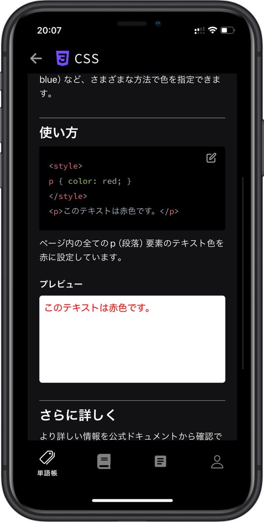 全ての単語にサンプルコードが収録されているため、単語の具体的な使い方を学ことも可能。