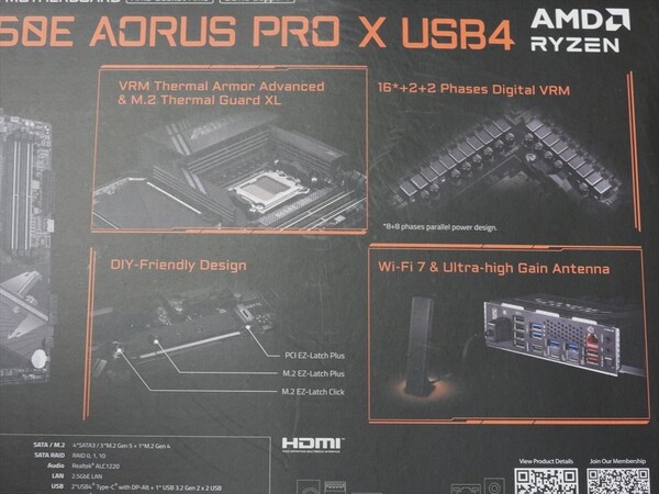 主なスペックは、拡張スロットがPCI Express(5.0) x16×1、PCI Express(4.0) x1×1(x16形状)、PCI Express(3.0) x1×2(x16形状)。メモリーはDDR5 DIMM×4(DDR5-8000+(OC)、最大192GB)。オンボードインターフェースとして、2.5ギガビットLAN(Realtek)、Wi-Fi 7 (IEEE 802.11a/b/g/n/ac/ax/be)+Bluetooth 5.4、サウンド(Realtek ALC1200 8CH HD Audio)、M.2×4、SATA3.0×4、USB Type-C×2、USB 3.2 Gen2×1(TypeC)、USB3.2 Gen1×2×6などを装備。グラフィックス出力機能としてHDMI 2.1、USB Type-C×2を備える。