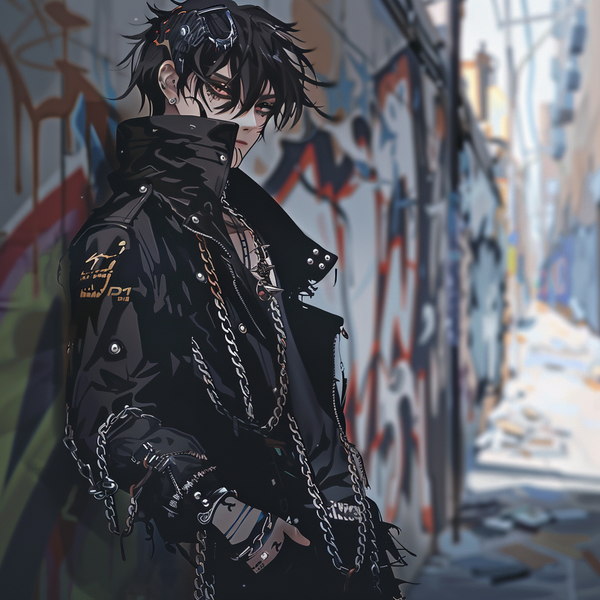 プロンプト:A cool anime-style male character with heterochromatic eyes and a scar, wearing a modern punk-inspired outfit with chains and patches, leaning against a graffiti-covered wall in an alleyway(クールなアニメスタイルの男性キャラクターで、異色症の目と傷が特徴です。モダンなパンク風の服装をしており、チェーンやパッチが付いています。路地のグラフィティで覆われた壁にもたれかかっています)