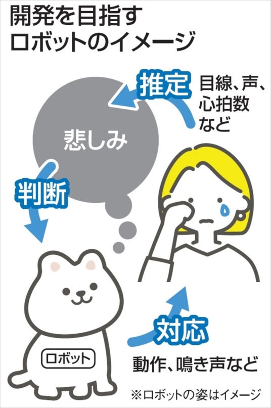センサーを使って持ち主の声や視線などから感情を読み取り、適切な反応を示すロボットにするの事を目標とし、ウエアラブル(着衣型)機器などで心拍数や瞳孔、声の特徴などを数値化し、前向きや後ろ向きなどの感情と結び付けてAIに学習させます。