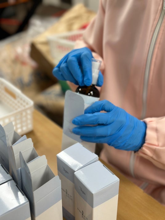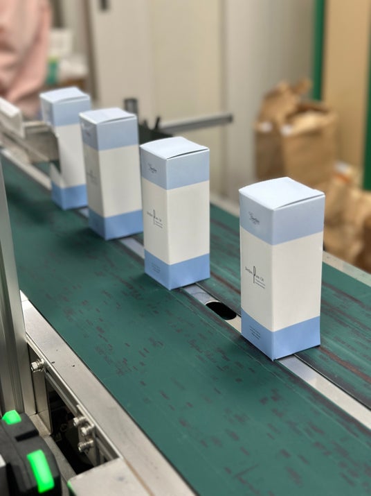 ラベリングが完了した製品を検品し、不良品がないかを確認します。その後、製品を箱に詰めます。