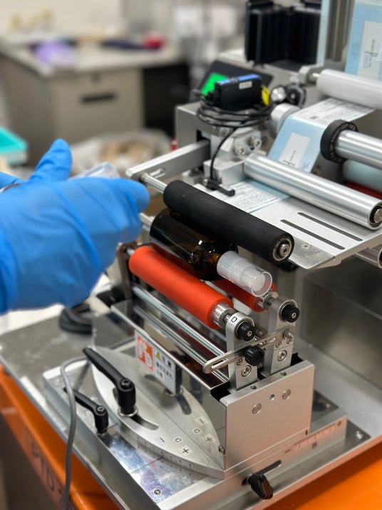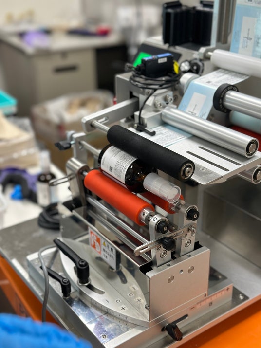 キャップが締められたボトルにラベルを貼ります。自動ラベリング機を使用して、正確かつ均一にラベルを貼付けます。