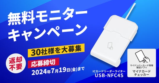 抽選で30社様に、マイナンバーカード情報確認アプリ「マイナカードチェッカー」(無料)と、ICカードリーダーライター「USB-NFC4S」を合わせてお試しいただき、実際に使用した感想のアンケート協力をいただける企業様を募集しております。ご協力いただける方には、「USB-NFC4S」1台を無料でご提供します。