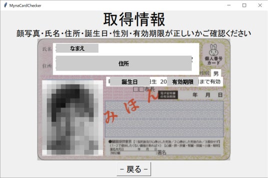 カードをICカードリーダーライターにかざし、券面印字内容の情報を入力することで、ICチップ内の基本4情報(氏名・住所・誕生日・性別)と有効期限、顔写真が表示されます。