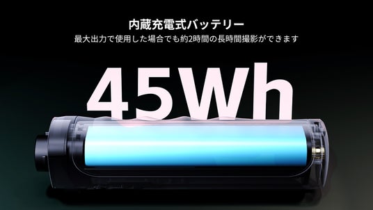 ハンドルに45Whのバッテリーを内蔵され、最大出力で使用した場合でも約2時間の長時間撮影ができます。また、ライト本体とハンドルの両方にUSB PD対応のUSB-Cポートが装備されており、充電しながらライトを使用できます。