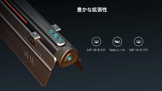 本体には複数の1/4インチねじ穴、3/8インチねじ穴、Natoレールなど複数のインターフェースがあり、手持ち撮影以外様々な取り付け方を柔軟に拡張できます。ストラップも付けることが可能で、長時間の使用中の手の疲労を軽減し、落下の防止にも役立ちます。