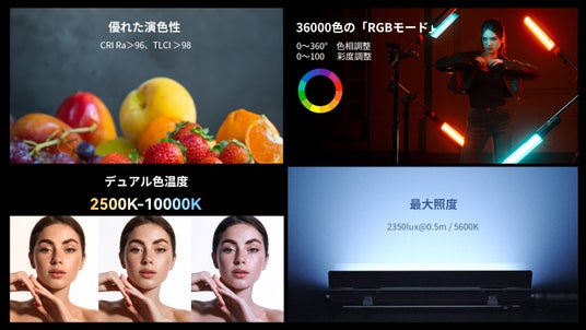 ディフューザー装着時0.5m 5600Kで2350luxを出力できます。また、CRI Raは96+、TLCI は98+に達し、演色性に優れます。2500K~10000Kと幅広い色温度の「CCTモード」のほか、最大36000色の「RGBモード」、18種の「特殊効果モード」、8種の「カラーペーパーモード」、5種の「プリセットモード」が搭載されており、多様多彩な照明効果を提供します。