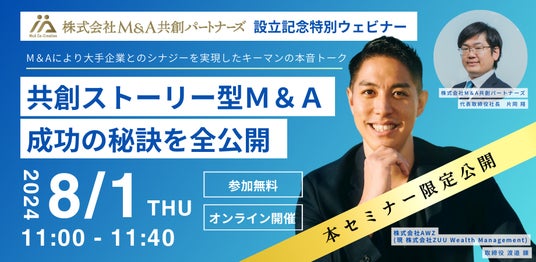 Cloud Link Group株式会社(本社:東京都港区、代表取締役社長:梅野 且貴、以下「クラウドリンクグループ」)は、M&A仲介事業を行う株式会社M&A共創パートナーズ(本社:東京都港区、代表取締役社長:片岡 翔、以下「M&A共創パートナーズ」)を設立し、事業を本格開始したことをお知らせいたします。また、2024年8月1日に「共創ストーリー型M&A 成功の秘訣を大公開」と題して、株式会社ZUU Wealth Management(※2023年1月31日に株式会社AWZから商号変更 本社:東京都目黒区、代表取締役社長:高木 貴行、以下「ZUU Wealth Management」)と共催ウェビナーを開催いたします。
