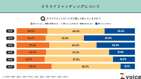 まず、クラウドファンディングについて知っているかを聞いたところ、「概要を説明できる」と答えたのは全体のわずか26.0%でした。さらに、全体の25.6%は「聞いたことがない」という回答に。