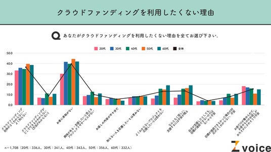 また、「よくわからないプロジェクトを応援したいとは思わない」「なんとなく怪しい。支援するには不安が残る」は年代が上がるほど多く挙がり、逆に「お金だけが集められて、リターンがおろそかにされそうで不安」は若年層から多く挙がる傾向が見られました。