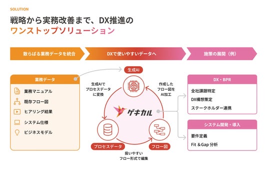 私たちは、DX・生成AI時代に合わせた業務フロー作成ツール「ゲキカル」を開発し、提供することで組織横断DXプロジェクトを活性化し、長期的なコスト削減・利益最大化を実現。誰もが安心と誇りと希望をもってWinを感じられる社会の実現に貢献したいと考えています。