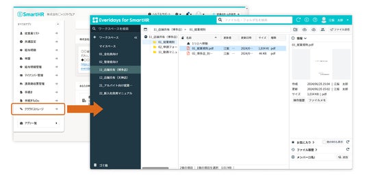 「Everidays for SmartHR」は、SmartHR専用に設計されたクラウドストレージです。就業規則や社内マニュアルなどの書類を安全に保管し、「SmartHR」の従業員アカウントで簡単に共有できることが特徴です。