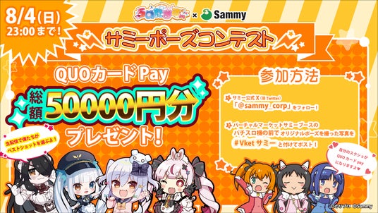 サミーブースのパチスロの前で、自身が考えたオリジナルポーズをとったアバターの写真を、「#Vketサミー」をつけてSNSに投稿することで応募完了!優秀作品にはオリジナルデザインのQUOカードPay総額50,000円分をプレゼントします。
