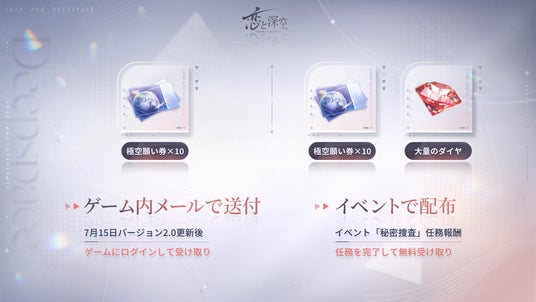 7月15日から期間中ログインすると、極空願い券×10や、イベント「秘密捜査」任務報酬として極空願い券×10や、ダイヤなどを獲得することができます。