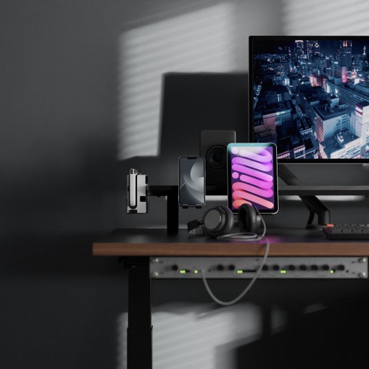 専用のモジュールは、デスクトップ/ラップトップPCやタブレットなどはもちろん、書類や小物、ヘッドフォン、ゲーム機などにも対応。ケーブルをきれいに配線できるアダプタやホルダーもあり、机の表も裏も利便性が高くスッキリした環境を構築できます。(特許取得済)