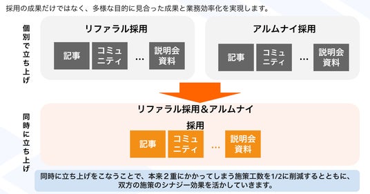 当社の提供する「アルムナイ採用とリファラル採用の同時立ち上げサービス」においては、個別で立ち上げるときと比較して、工数を約半数に抑えながら、シナジー効果を最大化していきます。