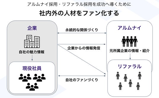 そのような自社のファンとなっていただく取り組みを、社内だけでなく社外のアルムナイの方々にも広げていくことによって、社内外の人材をファンにし、リファラル採用と同時に、アルムナイ採用にまで繋げていくことを実現していきます。