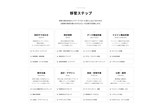 「Wordpressからの移管」「CMSのみSTUDIO化」「FigmaからのSTUDIO実装」などフレキシブルに対応します。サイト運用に悩むご担当者様、リニューアルを検討中の事業担当者様はぜひ一度ご相談ください。