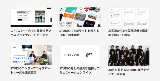 また、STUDIOのエキスパートとしての活動として、実績の積み重ねや制作フローの改善・向上にも力を入れてきました。これまでにgazで制作したWEBサイトはフルスクラッチで350サイト以上です。自社のコーポレートサイト、サービスサイトもすべてSTUDIOで構築しており、安定的なPV数と案件相談をいただいております。