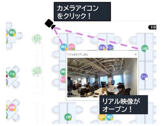オフィスレイアウト図にカメラを設置、自席からワンクリックで現場の映像を確認