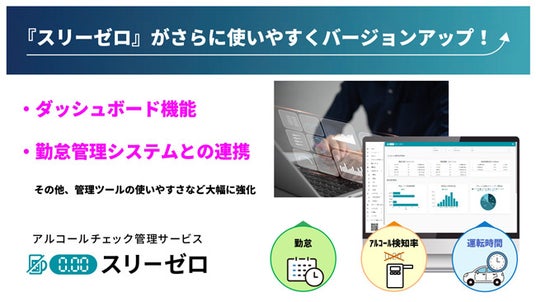 シャープの子会社である株式会社AIoTクラウド(本社:東京都江東区、代表取締役社長:松本 融)は、本年7月25日からアルコールチェック管理サービス『スリーゼロ』を、さらに使いやすくバージョンアップします。2023年12月から、一定台数以上の社用車を使用している企業に対して、法令によりアルコール検知器の使用義務化が開始され、各企業の安全運転管理者はアルコール検査の徹底に加え、厳格な管理運用が求められるようになりました。AIoTクラウドは『スリーゼロ』のサービス開始以後、お客様からご要望があった各現場の状況を可視化して管理業務をサポートする「ダッシュボード機能」の追加や、市場シェアNo.1(※1)の勤怠管理システム「KING OF TIME(※2)」との連携など、より便利にお使いいただくための大幅アップデートを実施します。