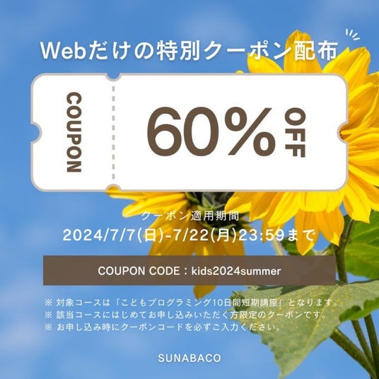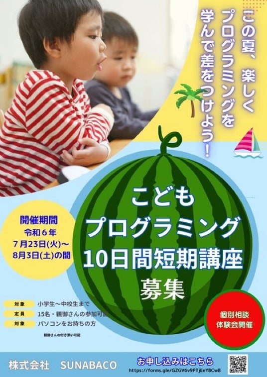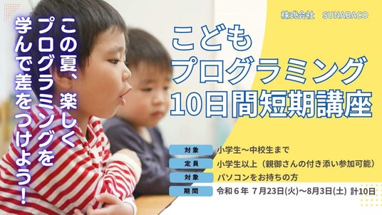 【2024夏休み期間限定】挫折率1%以下のプログラミングスクールSUNABACOが、「こどもプログラミング10日間短期講座」を開講