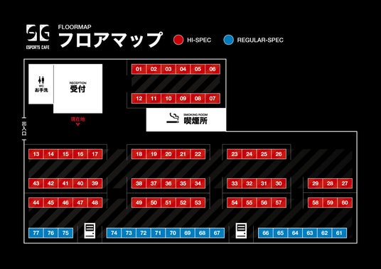 設備:PC ハイスペックゲーミングPC席60席 レギュラースペックゲーミングPC席17席