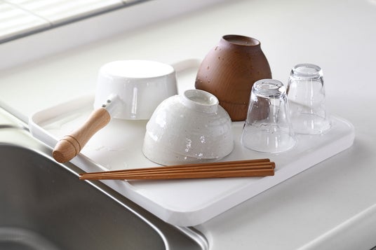 フチに向かって傾斜、水が奥に流れて溜まります。フチがあるので、食器などの収まりもよいです。