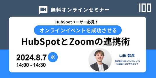 HubSpot Smart CRM(TM)の導入と運用支援サービスを通じてRevOpsソリューションを提供する株式会社100(ハンドレッド、本社:東京都世田谷区、代表取締役:田村 慶)は、2024年8月7日(水)14時から「オンラインイベントを成功させるHubSpotとZoom連携術」をテーマにオンラインセミナーを開催いたします。