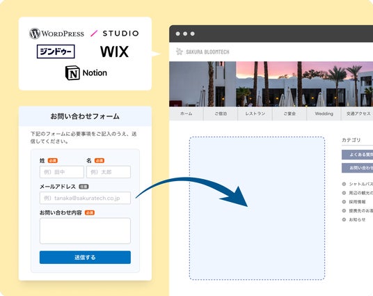 「iframeフォーム埋め込み機能」は、一般的なウェブサイトをはじめ、WordPress(ワードプレス)、STUDIO、ジンドゥー、Wix、Notionなどで作成したウェブサイトにも対応しており、月額利用料0円の「無料プラン」を含むすべてのプランで利用できます。