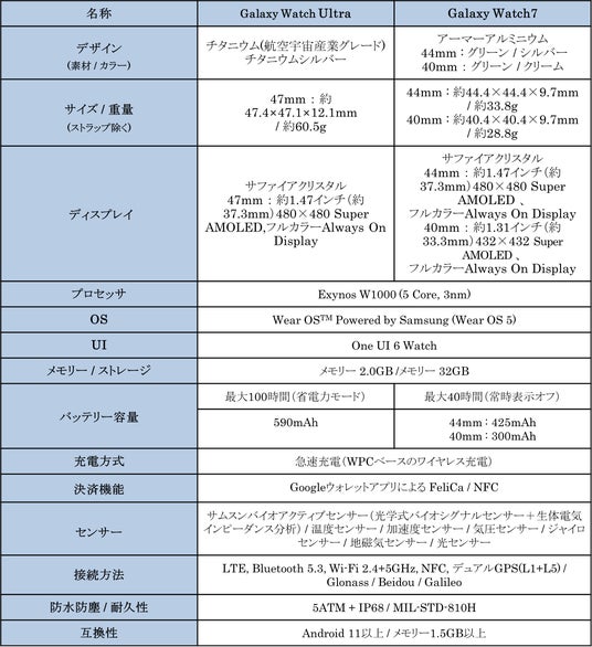 「Galaxy Watch Ultra」「Galaxy Watch7」の特長は、以下のとおりです。