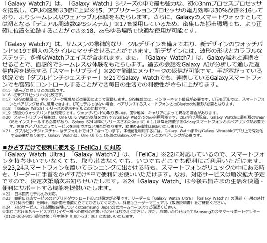 サムスン電子ジャパン株式会社(以下サムスン)は、「FeliCa」に対応し健康的な毎日のモチベーションとパフォーマンスを上げる最新スマートウォッチ「Galaxy Watch Ultra (LTE)」「Galaxy Watch7 (LTE)」の発売をKDDI株式会社(以下、au)および沖縄セルラー電話株式会社で決定したことをお知らせいたします。