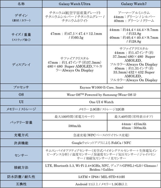 <主な仕様 : 「Galaxy Watch Ultra」「Galaxy Watch7」(LTEモデル)>