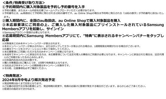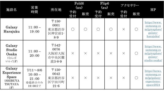 「Galaxy Z Fold6」「Galaxy Z Flip6」は2024年7月17日(水)より予約受付を開始し、2024年7月31日(水)より販売を開始。「Galaxy Z Fold6」「Galaxy Z Flip6」の純正・専用アクセサリーは、2024年7月下旬以降より販売を開始いたします。これらの製品は全国のau取扱店、au +1 collection取扱店、au Online Shopおよび世界最大級のショーケース「Galaxy Harajuku」(東京・原宿)「Galaxy Studio Osaka」(大阪・なんば)、「Galaxy Experience Space」(SHIBUYA TSUTAYA 1F)にて取り扱いいたします。