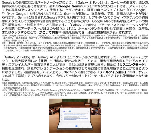 ※1 一部のGalaxy AIの機能の使用には、Samsungアカウントへのログインが必要な場合があります。当社はAI機能によって提供されるものに対し、正確性、完全性および信頼性について、いかなる保証もいたしません。国や地域、OS/One UIバージョン、デバイスのモデル、キャリアによって使用できるGalaxy AI機能は異なります。一部の機種では、対応する機能が制限される場合があります。Galaxy AIの機能は、一部の国や地域ではAI使用に関する年齢制限のため、未成年は利用が制限される場合があります。Galaxy AIは対応するGalaxyデバイスで2025年末まで無料で提供される機能です。 第三者が提供するAI機能には、異なる条件を適用する可能性があります。