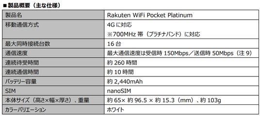 ■「Rakuten WiFi Pocket Platinum」製品ページ