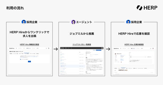 採用企業は『HERP Hire』から『ジョブミル』の求人一覧にワンクリックで求人を出稿できます。出稿された求人に対して人材紹介会社が『ジョブミル』上から推薦することで、採用企業は『HERP Hire』上から推薦された求職者の情報を確認できます。