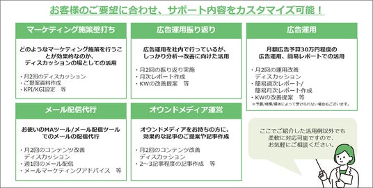 特にマーケティング領域を強みとしており、広告運用、SNS、SEO、オウンドメディア 、動画、広報・PRなど施策が多様化、高度化する中で、スキルと実績の豊富なマーケティングプロ人材を戦略から実務まで必要なボリュームでアサインすることができます。