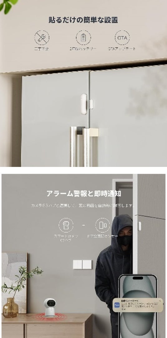 ドアや窓に貼るだけで、ドア/窓を開いた際に、スマホに即時通知を送信します。充電すること一切なし。2年間のバッテリー寿命付きです。