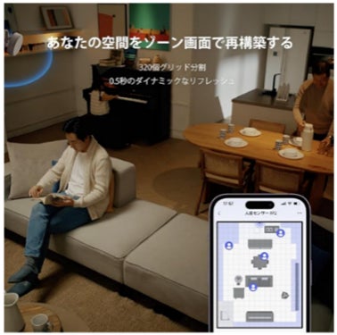 ミリ波レーダーを搭載したFP2人感センサーは、従来の赤外線センサーが抱える検知精度の低さの問題を解決。最大40平方メートルの部屋を最大30箇所のエリアに分割して検知できるだけではなく、最大5人の存在を同時に検知することができます。また従来の製品でよくみられていた「動きがないときの存在をリアルタイムで検知できない」、「ペットやロボットなどに影響されやすい」、「複数ターゲットを検知でいない」などの問題を大幅に解消し、ゾーン分割、複数人同時検知、転倒検知、睡眠観測など生活をよりスマートにできる高度な機能を搭載しています。
