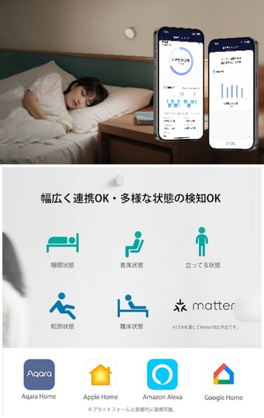 人感センサーFP2は転倒を感知し即時でアラーム通知を送ることができます。カメラを設置する必要がなく、プライバシー保護を実現しながら大切な人を見守り、非常時に備えることができます。また、取り付け方法により、FP2は睡眠時間、睡眠段階、心拍数、呼吸回数などのデータをリアルタイムで観測し、高齢者などの就寝中の健康状態をリモートでも常に確認できます。FP2の転倒感知と睡眠観測機能を利用すれば、高齢者のリモート介護がより簡単かつ安心に行なえます。