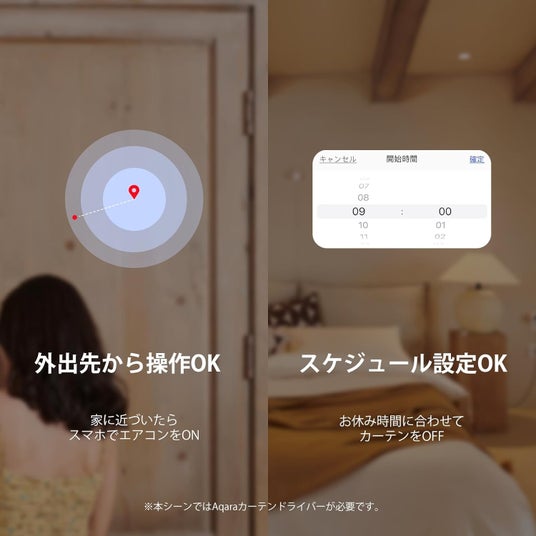 外出先でもスマホで簡単に遠隔操作が可能です。例えば、帰宅と同時に外出先から自宅のエアコンをONにすることや、スマホでドアの鍵を遠隔で施錠することもできます。また、タイマーによる設定も可能となっており、「平日の朝7時にカーテンを自動的に開ける」などの定時的な設定も実現することができます。