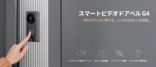 スマートビデオドアベルG4は世界初のバッテリー式のHomeKitセキュアビデオドアベルです。これにより、連携させたiPhoneのホームアプリで来客の確認と通話が可能になり、不在時に配達が来た場合「ドアの近くに置いといてください」と直接お願いするなどのシーンを実現できます。また、GoogleやAlexaのスマートディスプレイへのローカルストリーミングにも対応おります。