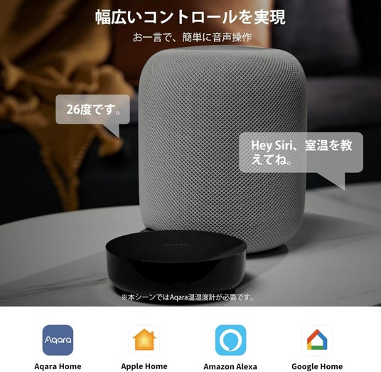 HomeKit、Alexa、Google Home、Siriなどのエコシステムで音声操作、遠隔操作、またはタイマー設定などに完全に対応しています。例えば、「Hey Siri、室温を教えて」といった簡単な音声で操作することができます。