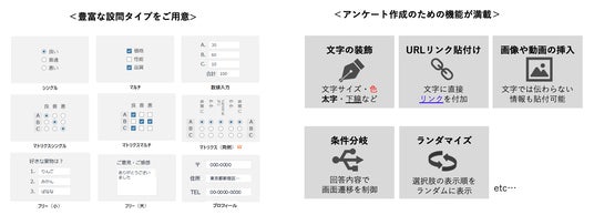 定量調査で使用される様々な設問タイプのほか、画像挿入など各種オプション機能が利用可能です。モニターアンケートも提供するSurveroidならではの本格的な調査を実施することが出来ます。