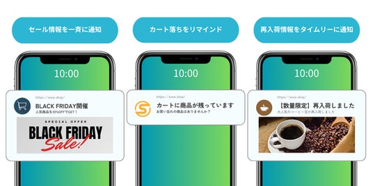 PUSH ONEを導入することで、アプリ不要でユーザーに直接タイムセールや商品入荷などの情報を能動的に発信できるようになります。また、カート落ち/カゴ落ちユーザーへのリマインドプッシュ(カートプッシュ)も可能なため、再来訪の促進やカート落ち/カゴ落ち改善に向けたCRM施策を活発化することで、CVRの改善及び売上の向上が期待できます。