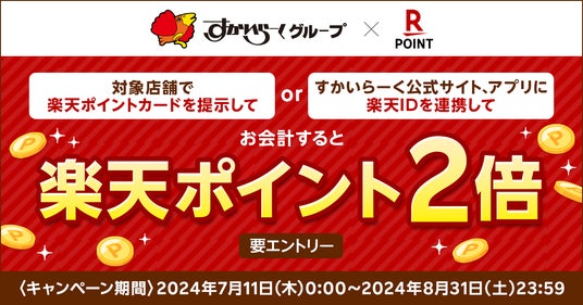 本キャンペーンは、キャンペーン期間中にエントリーのうえ、すかいらーくグループの対象店舗で「楽天ポイントカード」もしくは「楽天ポイントカード」機能が搭載されたアプリ、または「楽天カード」裏面のバーコードを提示して200円(税込)以上の会計、もしくは「すかいらーく公式サイト」または「すかいらーくアプリ」に楽天IDを連携(注)して、200円(税込)以上の注文(テイクアウト・宅配・通販)をした方に、「楽天ポイント」を通常の2倍進呈します。