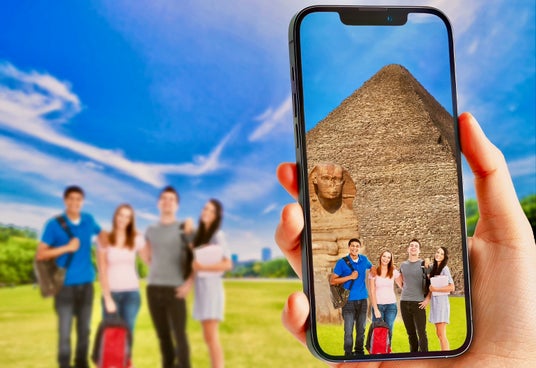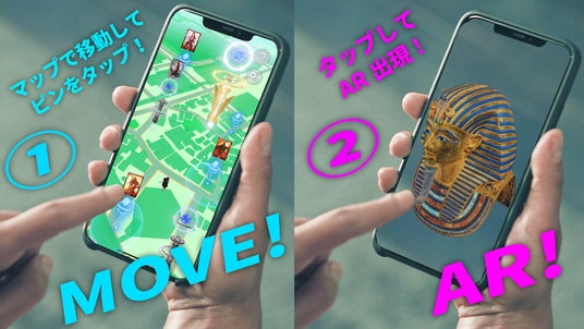 専用のアプリを使ってスマートフォンを通して見ると、現実の風景にエジプトの遺跡やスフィンクスが出現し、まるでその場に本物の遺跡があるかのような体験ができます。